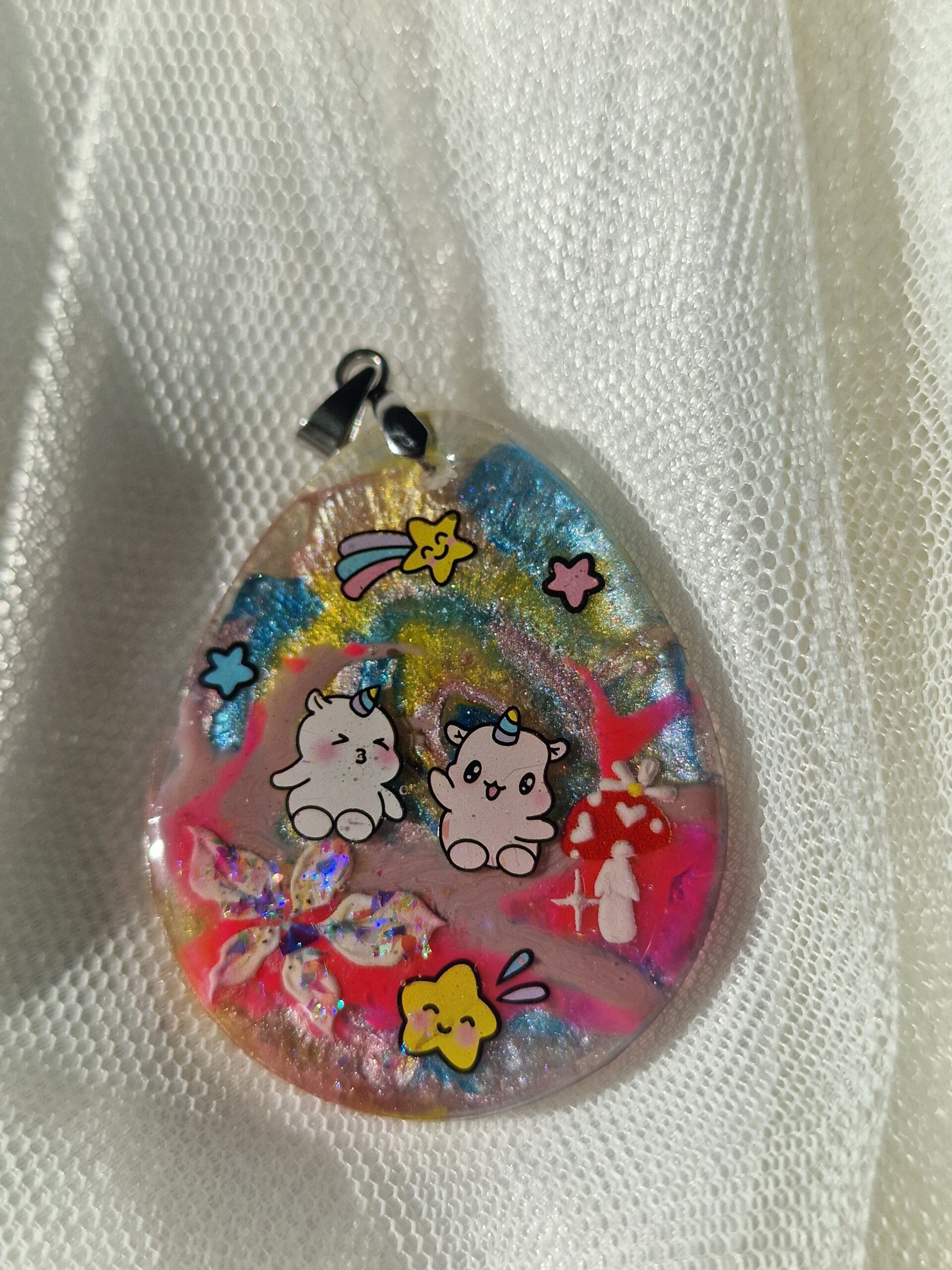 Plongez dans un univers enchanté avec cette adorable création artisanale en résine ! Fabriqué à la main avec soin, ce bijou féerique renferme une mignon et attendrissant personnage , cachés au ❤️ d'un monde magique scintiillant. Pour ajoutez une touche de réve a votre tenue