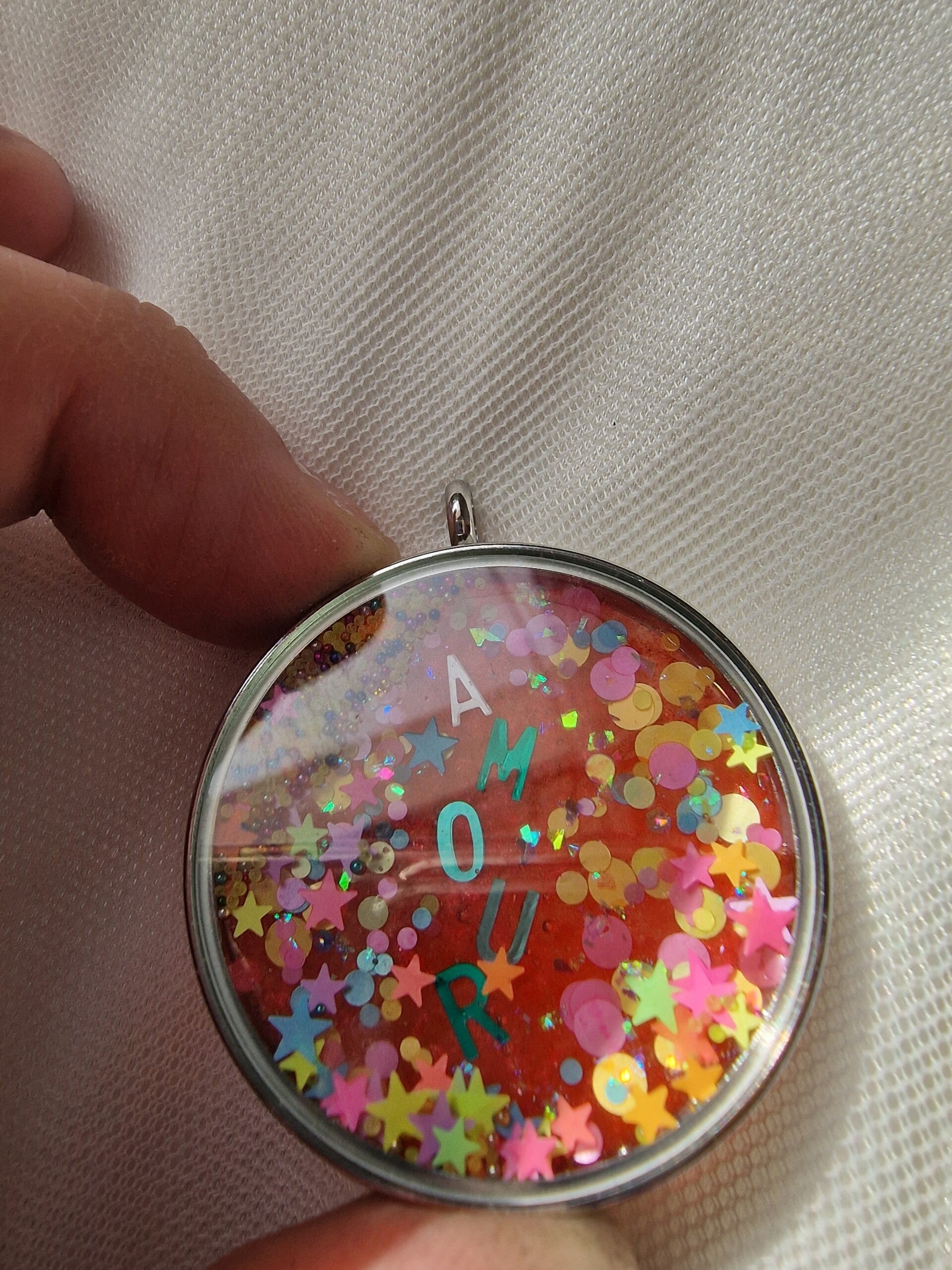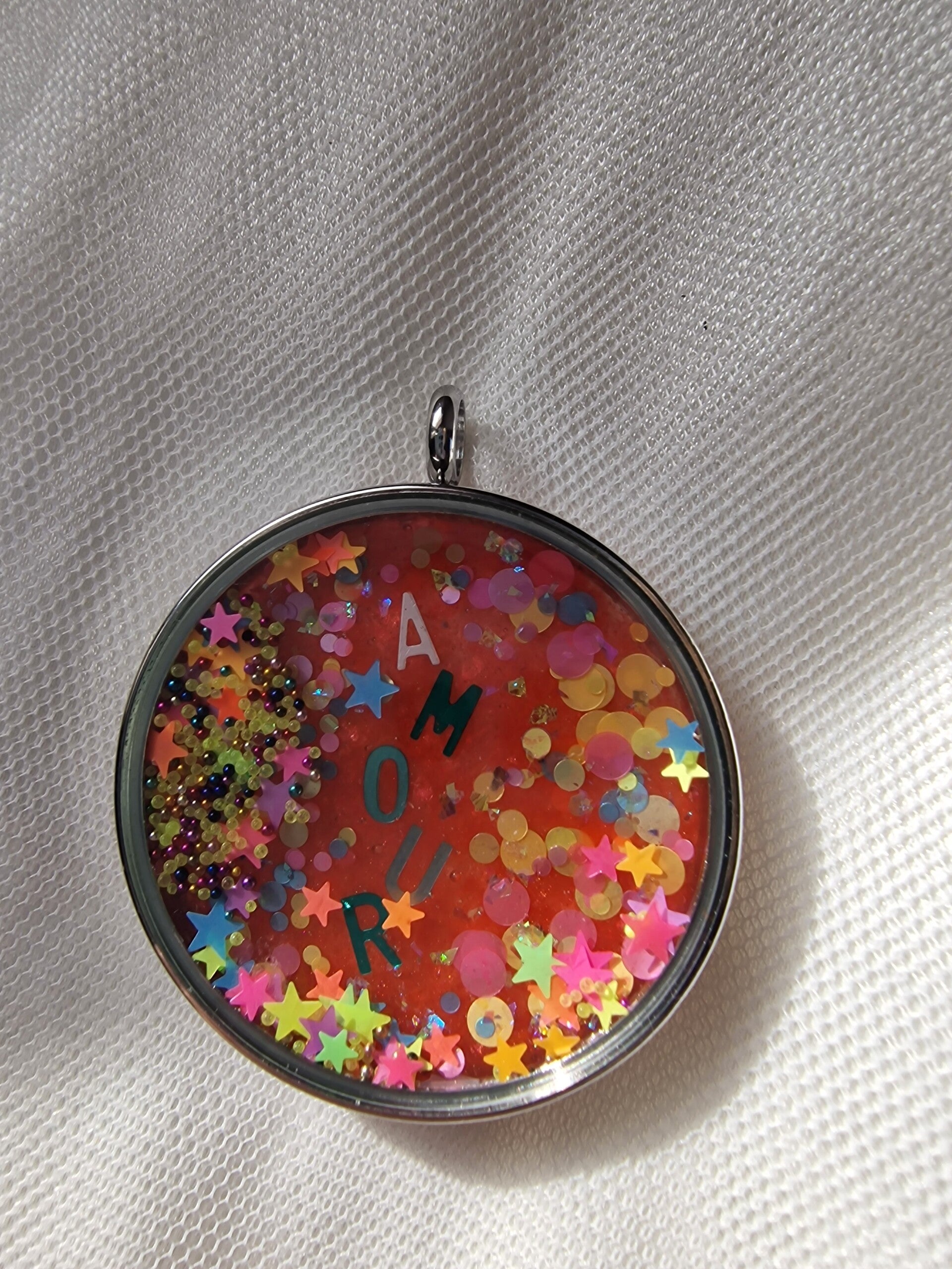 Chaque pendentif est réalisé à la main, avec soin, dans une résine colorée et remplie de détails lumineux et scintillants.
