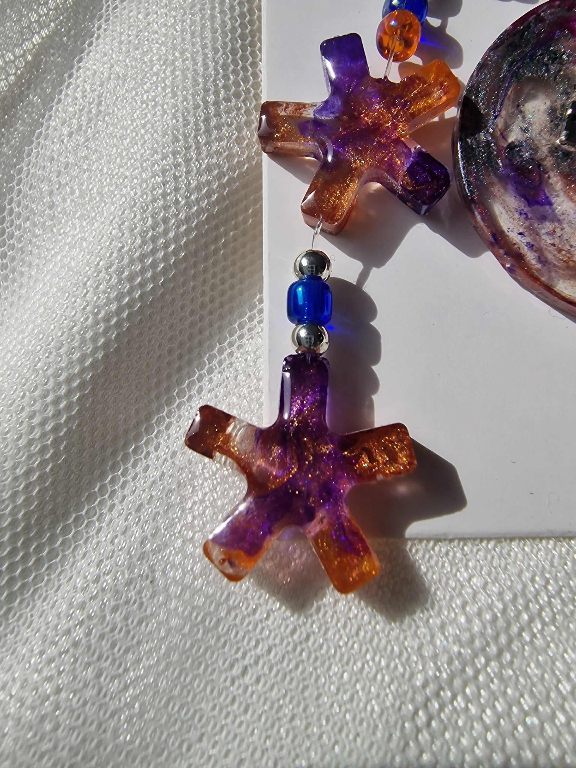 Chaque pièce est réalisée en résine avec des inclusions scintillantes qui captent la lumière et révèlent un univers de couleurs et d’étoiles.